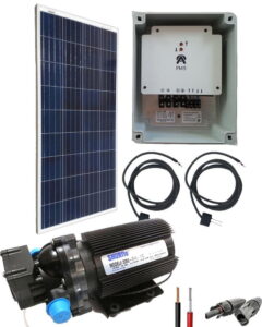 Kits solares de bombeo directo: son muy útiles ya que hacen funcionar una bomba de agua en corriente continua con un rango de voltaje que el kit solar de bombeo requiera. A través de este tipo de kits solares o kit paneles solares, podemos hacer funcionar una bomba de agua de manera directa a través de la energía que producen los paneles solares a tiempo real, evitando así hacer uso de las baterías, de generadores o de la misma red eléctrica. Durante las horas de sol, los kits solares kit paneles solares o kit de bombeo de agua solar directo serán capaces de hacer funcionar bomba de agua sin ningún problema como si se tratara de una bomba convencional, mientras que, durante las horas de noche, se mantendrán en reposo e inactiva. Son sistemas muy rentables el kit solar de bombeo para pozo ya que en el caso que la bomba de agua funcione con un generador de gasolina hará muy caro el regadío. Además, la instalación solar de bomba sumergible para pozo es muy sencilla y no precisa de mantenimiento de ningún tipo, reduciendo el plazo de amortización de la misma.